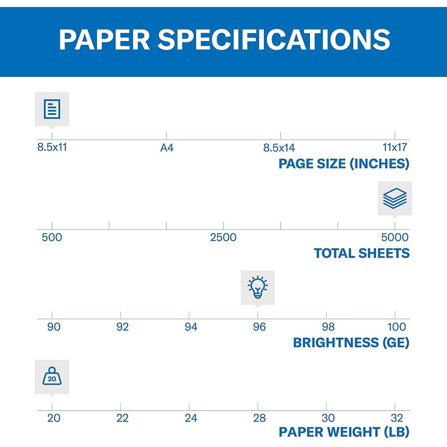 96 Brightness – Letter – 8 1/2″ x 11″ – 20 lb Basis Weight – Acid-free – White – 500 Sheets per Ream – 10 / Carton