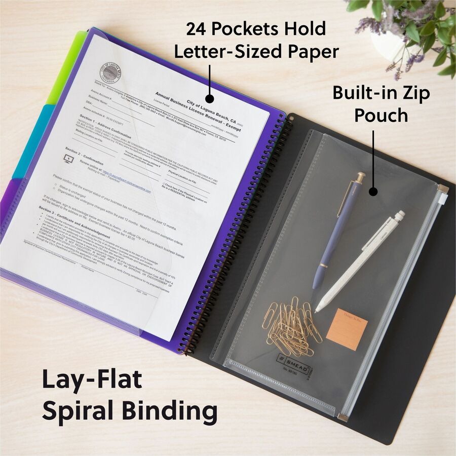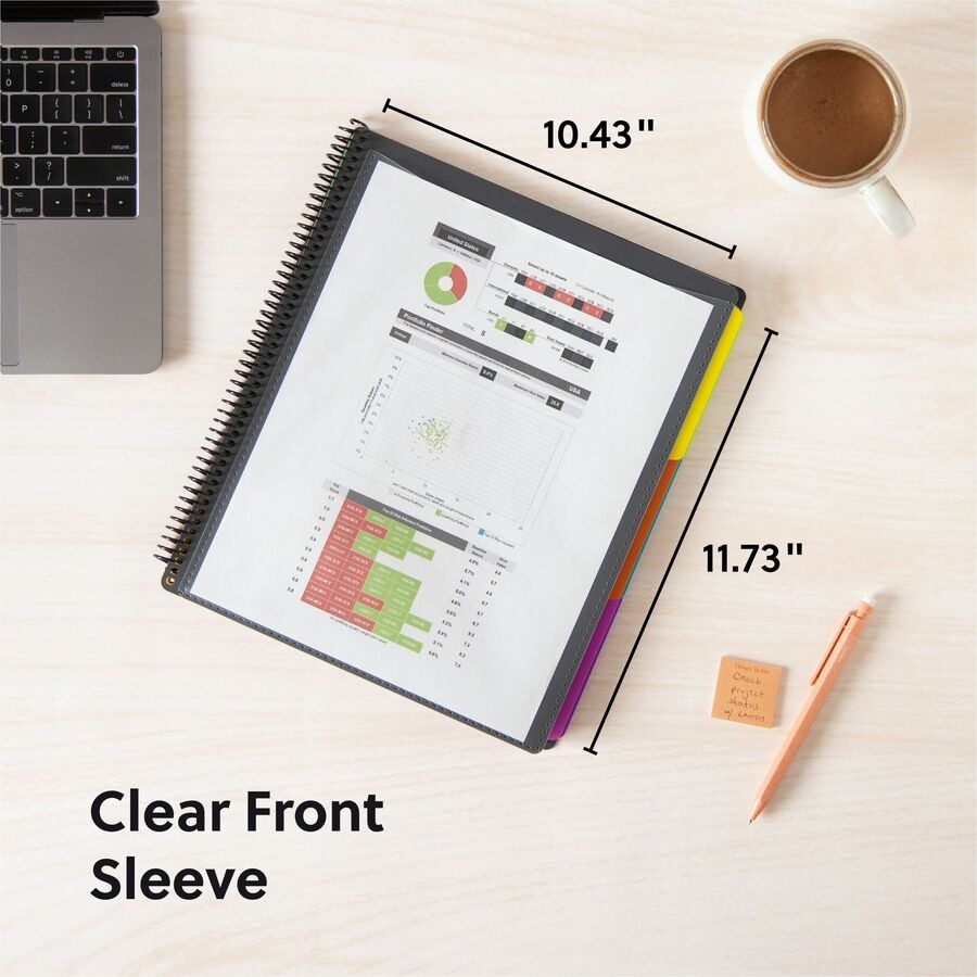 - Slash pockets with 1/3-cut tabs hold up to 25 sheets each; spiral-bound to lay the organizer flat for easy use; tear-resistant, water-resistant, poly cover for long-lasting durability